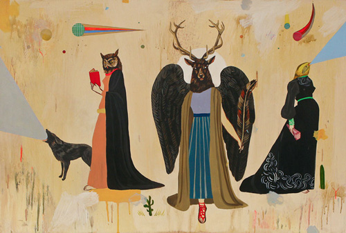 I shall leave you for the weekend with these amazing paintings by Nalini "Deedee Cheriel" depicting "fantastic narratives where a beautiful & symbiotic relationship is formed between humans and animals or hybrids of the two". I am blown away by the work of this Los Angeles based artist who had an Hindu upbringing and a big influence of folk-art and landscaped of the Pacific Northwest. Her main subject matter is creatures with animal heads and human bodies, owls, roaring bears in bold dream-like setting representing people in artist's life, and the animals used represent emotional states or personal characteristics.